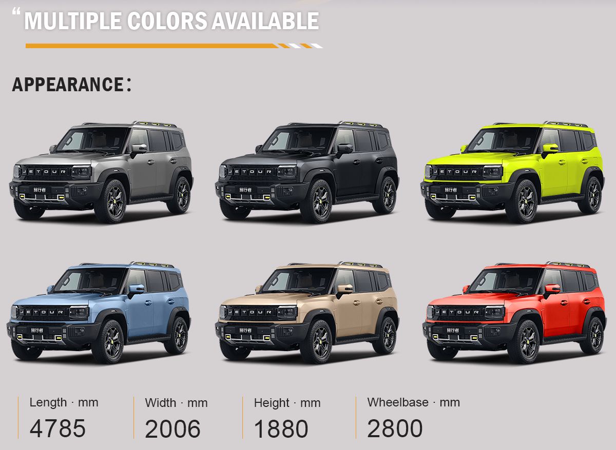 The Jetour traveler is positioned as a medium-sized SUV, with dimensions of 4785/2006/1800mm and a wheelbase of 2800mm. The ground clearance is 220mm, the approach angle is 28°, and the departure angle is 30°.