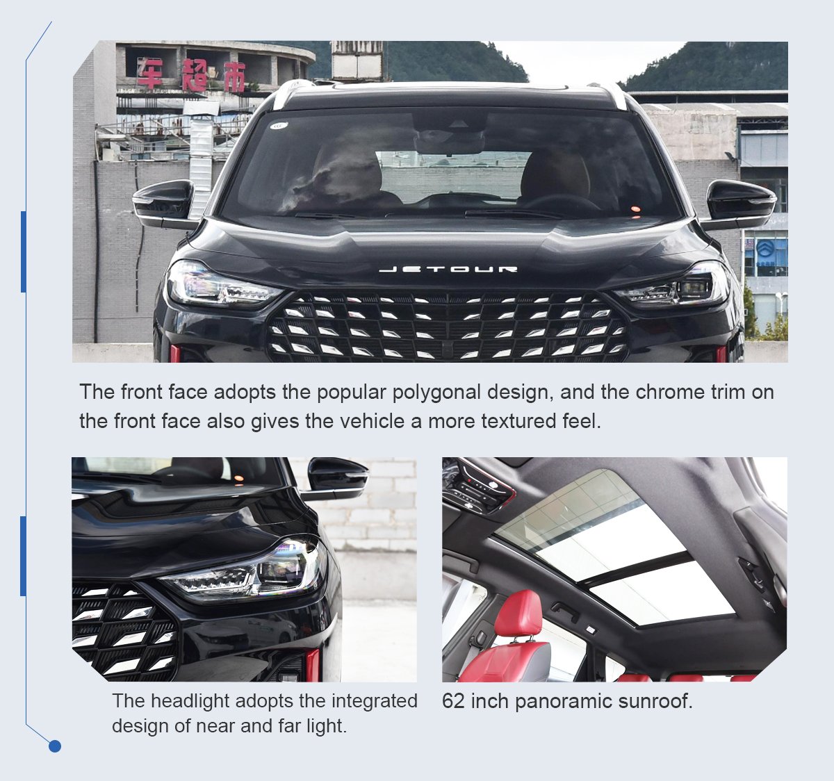 Jetour X70 Pro is a series of medium-sized crossover SUVs. As a medium-sized SUV, Jetour X70 Pro has dimensions of 4749/1900/1720mm and a wheelbase of 2745mm. One of the design highlights is the large matrix pattern grille at the front. Red trim, high-mounted brake lights, and four exhaust outlets further enhance the sportiness of the vehicle.